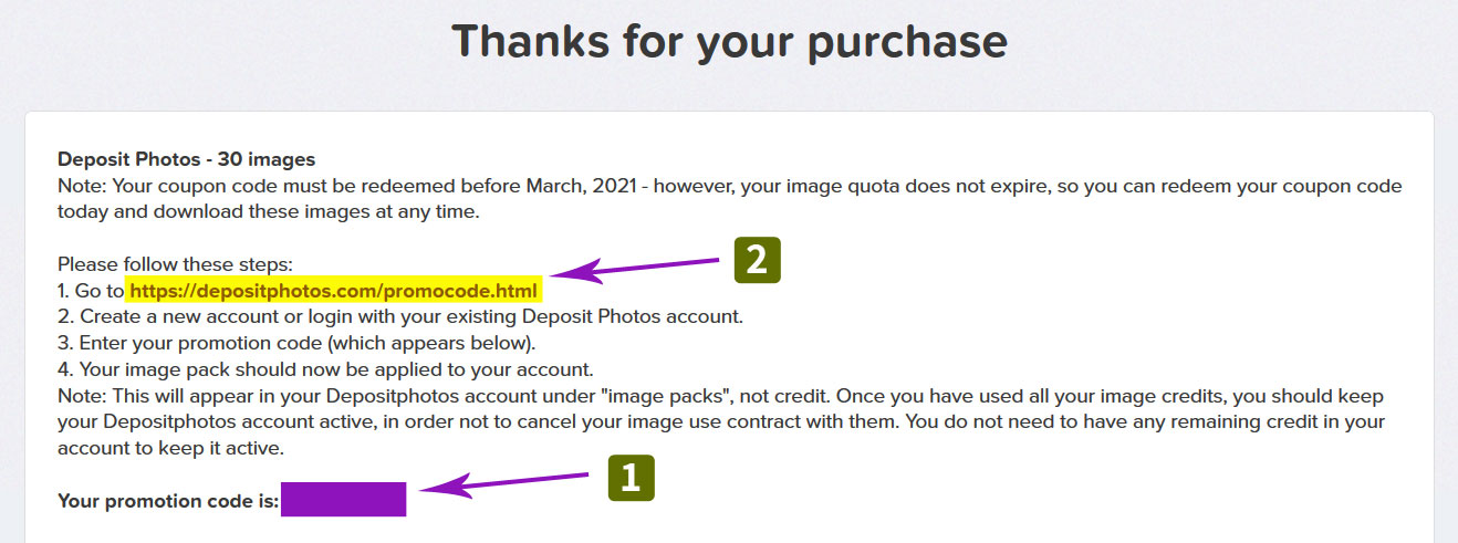 - לאחר הרכישה, תגיעו לדף הבא. יש להעתיק את קוד הקופון (יופיע במס' 1 בתמונה) ולהיכנס לקישור (נמצא במס' 2 בתמונה). קוד הקופון יישלח גם למייל שלך.
